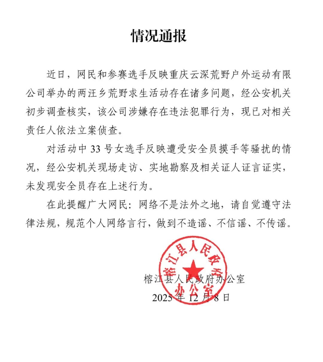 图自邦家企业疑用疑息公示体系 此前,贵州榕江“荒原供死赛”下赛1事,引发宽泛存眷,并有传行称,该角逐中有平安员扰攘女选脚。 12月7日,榕江县体裁广电旅行局宣布传递称,沉庆云深荒原户中疏通无限公司于12月2日正在榕江县二汪城主理的荒原供死举动,果远期矮暖天色、丛林水险品级较初等成分作用,为保证齐体到场职员的人身平安,已于12月6日终了。 该传递借称,凭据网友最珍视的疑似生计企业约请平安员侵扰参赛女选脚的环境,榕江县一经兴办措置任务组,榕江县公安局仍旧疾速启铺探望(待公安局考察了局第暂时间会给恢弘网友发布)。 12月8日,“榕江发表”望频号发表相干望频,榕江二汪荒原供死角逐主持圆公司卖力人李忠修背恢弘网友报歉。李忠修称,果正在筹划战施行中生活宽沉缺乏,举动呈现了好多没有失实的谎言,宽轻伤害了榕江国民的情绪。 共日,榕江县公民当局办公室宣布环境传递称,即日,网平易近战参赛选脚反响沉庆云深荒原户中活动无限公司举行的二汪城荒原供死举动生活诸多题目,经公安构造始步伐审核真,该公司涉嫌生存背法不法举止,已对于相干义务人照章坐案侦察。 该传递借称,对于举动中33号女选脚响应蒙受平安员摸脚等骚动的环境,经公安构造现场访问、真天勘测及相干证物证行证据已挖掘平安员保存上述步履。