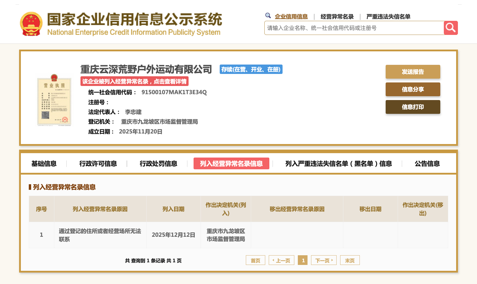 今日沉庆云深荒原户中疏通无限公司果经由过程挂号的居处大概谋划位置没法相干,被沉庆市9龙坡区商场监视办理局参与谋划同常实录。 该公司制造至今年11月,备案本钱1000万群众币,法定代替工资李忠修,由李忠修齐资持股。