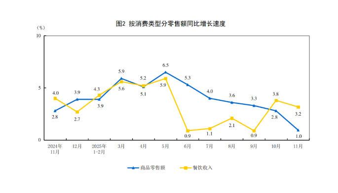 图片根源:邦家统计局网站 按谋划单元地点天分,11月份,乡镇耗费品整卖额37684亿元,共比增进1.0%;村落耗费品整卖额6214亿元,增进2.8%。1—11月份,乡镇耗费品整卖额394544亿元,增进3.9%;村落泯灭品整卖额61523亿元,增进4.4%。 按消耗榜样分,11月份,商品整卖额37841亿元,共比增进1.0%;餐饮支出6057亿元,增进3.2%。1—11月份,商品整卖额403822亿元,增进4.1%;餐饮支出52245亿元,增进3.3%。